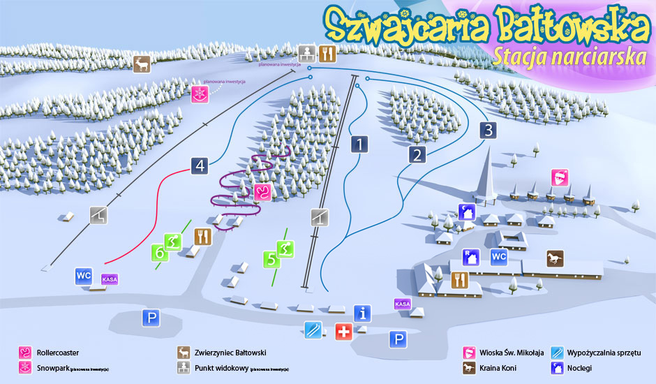 - Kompleks oferuje 5 tras narciarskich, o zróżnicowanej trudności.